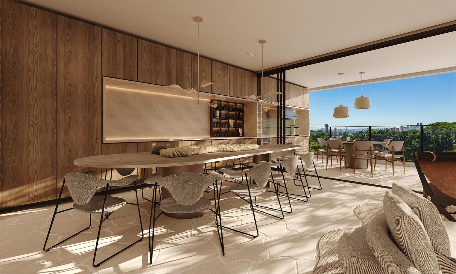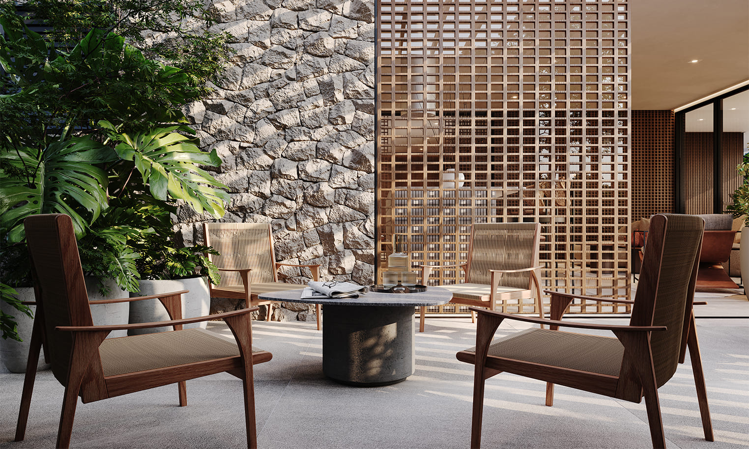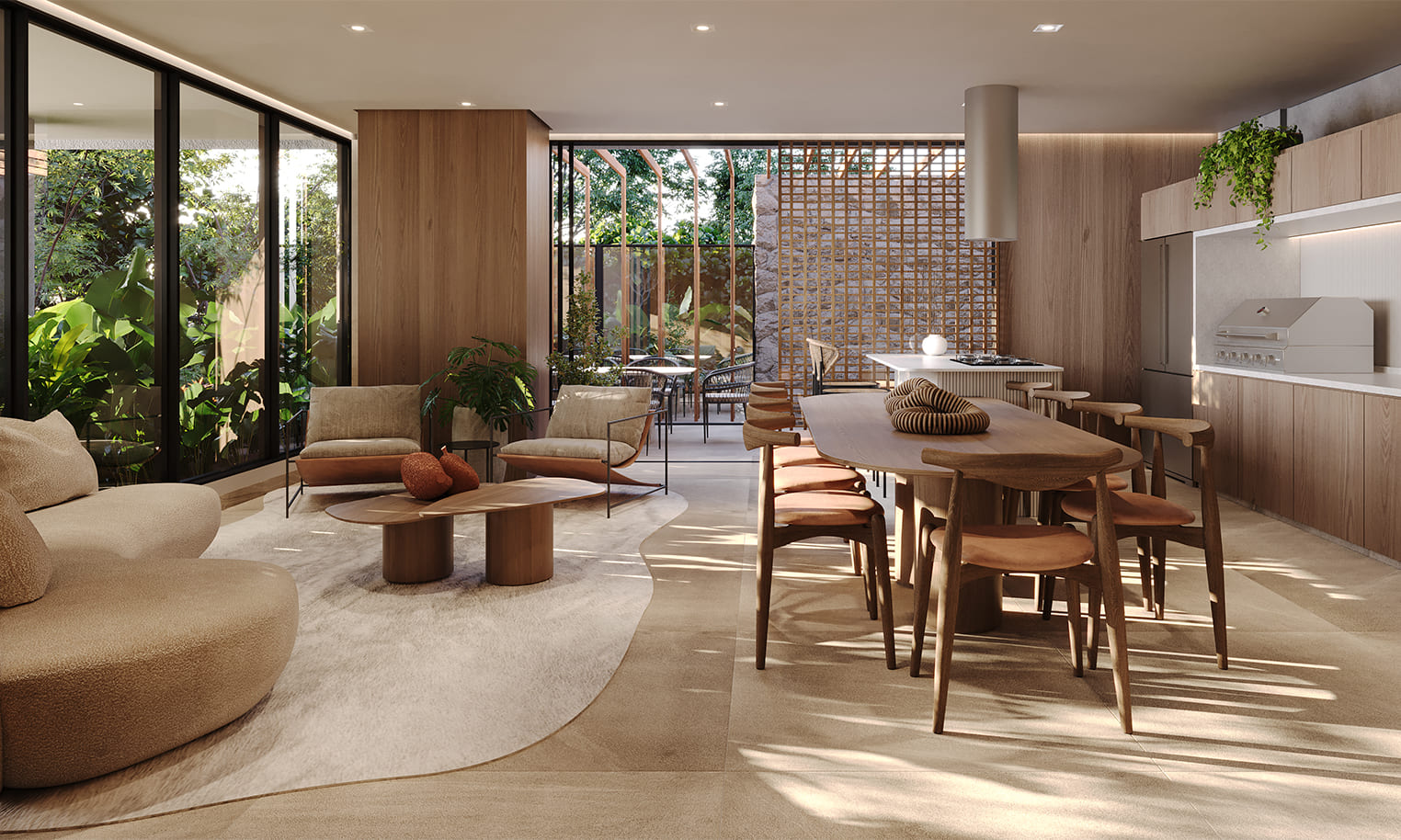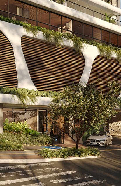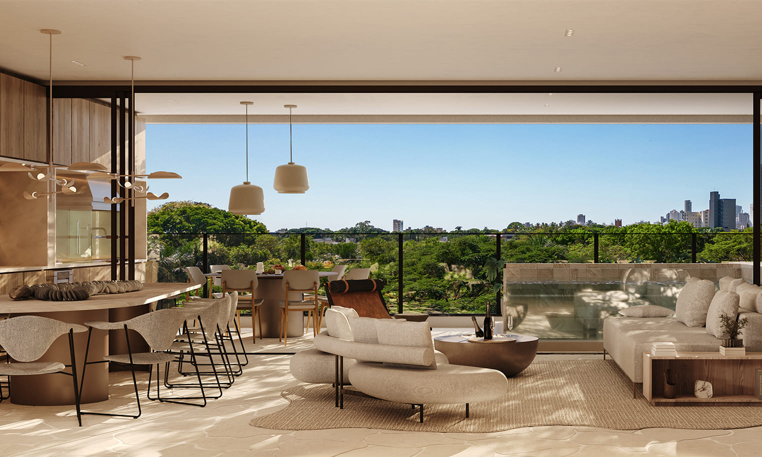 A Cardim Paisagismo assina o projeto, trazendo sua reconhecida expertise em botânica e design natural. Com vegetação 100% nativa, o paisagismo dialoga de forma orgânica com a arquitetura fluida do empreendimento, criando ambientes elegantes, acolhedores e profundamente conectados ao território. A seleção criteriosa de espécies e a composição equilibrada das áreas externas reforçam a sensação de bem-estar e elevam a experiência do morar.