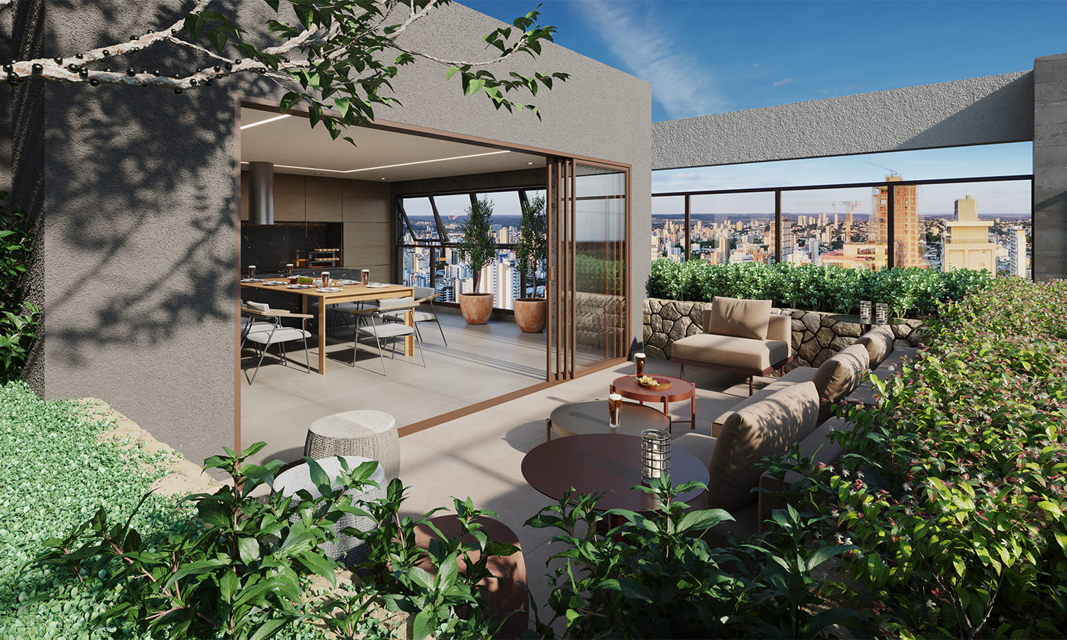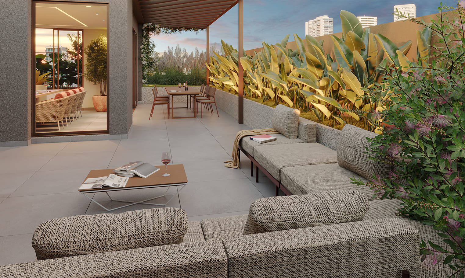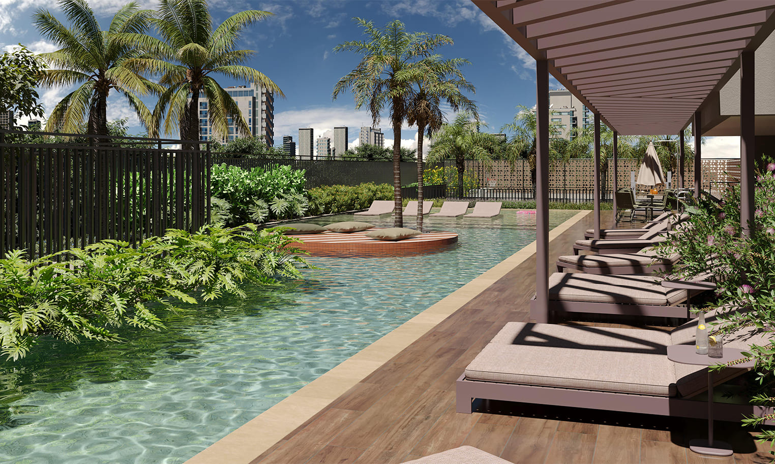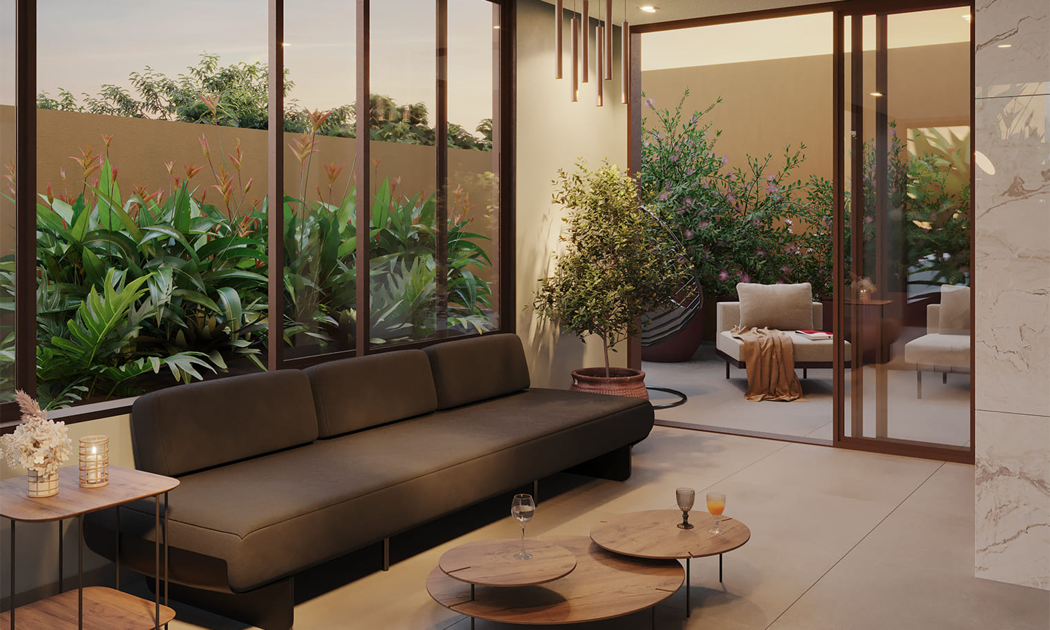 A Cardim Paisagismo assina o projeto, trazendo sua reconhecida expertise em botânica e design natural. Com vegetação 100% nativa, o paisagismo dialoga de forma orgânica com a arquitetura fluida do empreendimento, criando ambientes elegantes, acolhedores e profundamente conectados ao território. A seleção criteriosa de espécies e a composição equilibrada das áreas externas reforçam a sensação de bem-estar e elevam a experiência do morar.
