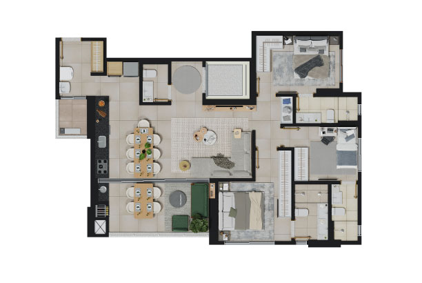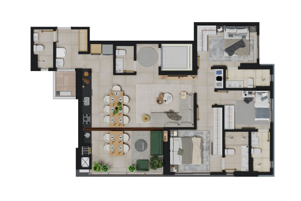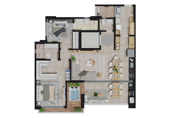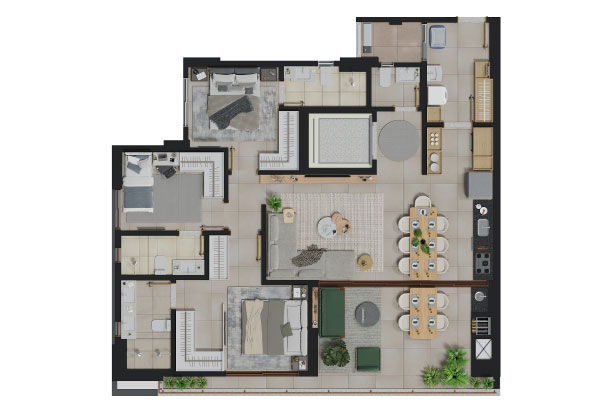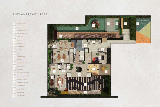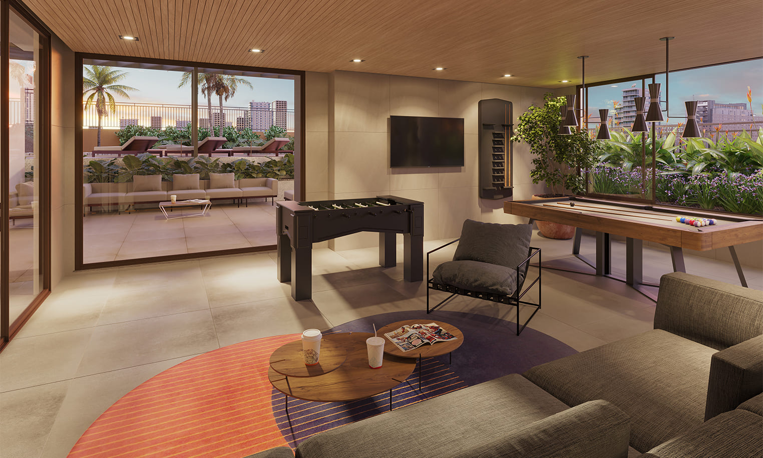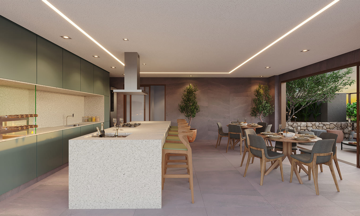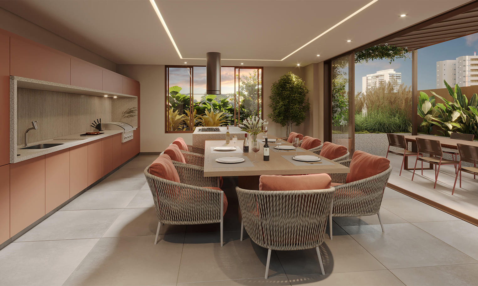 A Cardim Paisagismo assina o projeto, trazendo sua reconhecida expertise em botânica e design natural. Com vegetação 100% nativa, o paisagismo dialoga de forma orgânica com a arquitetura fluida do empreendimento, criando ambientes elegantes, acolhedores e profundamente conectados ao território. A seleção criteriosa de espécies e a composição equilibrada das áreas externas reforçam a sensação de bem-estar e elevam a experiência do morar.