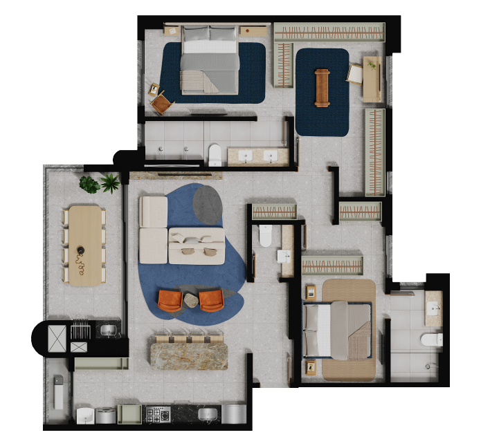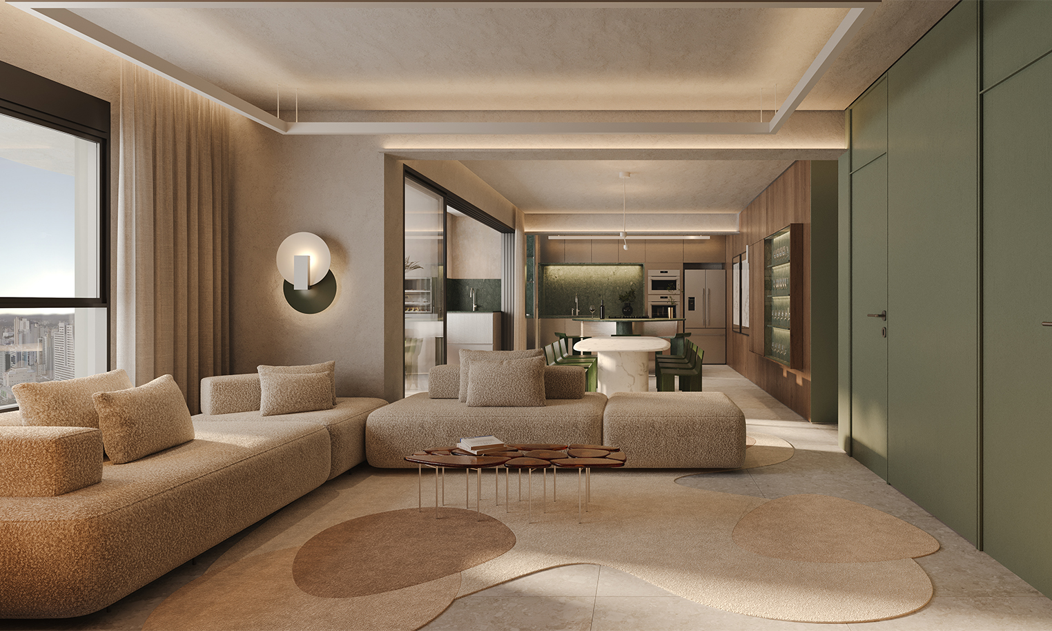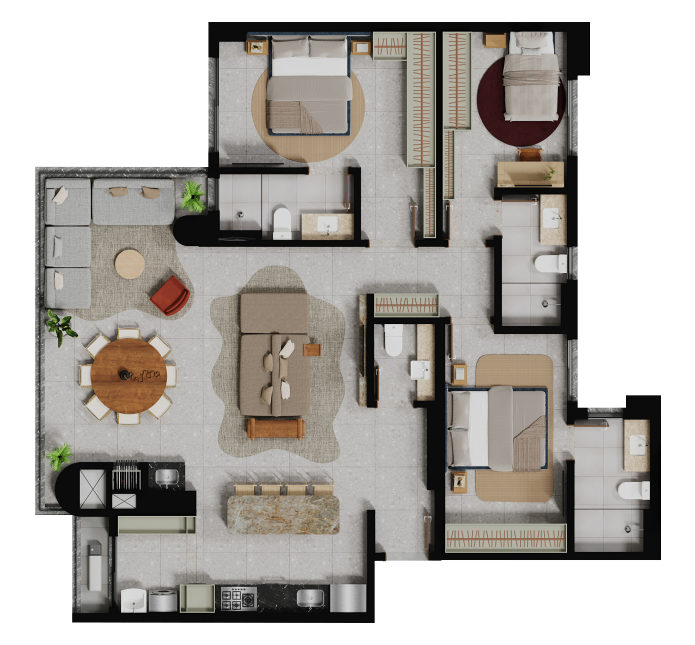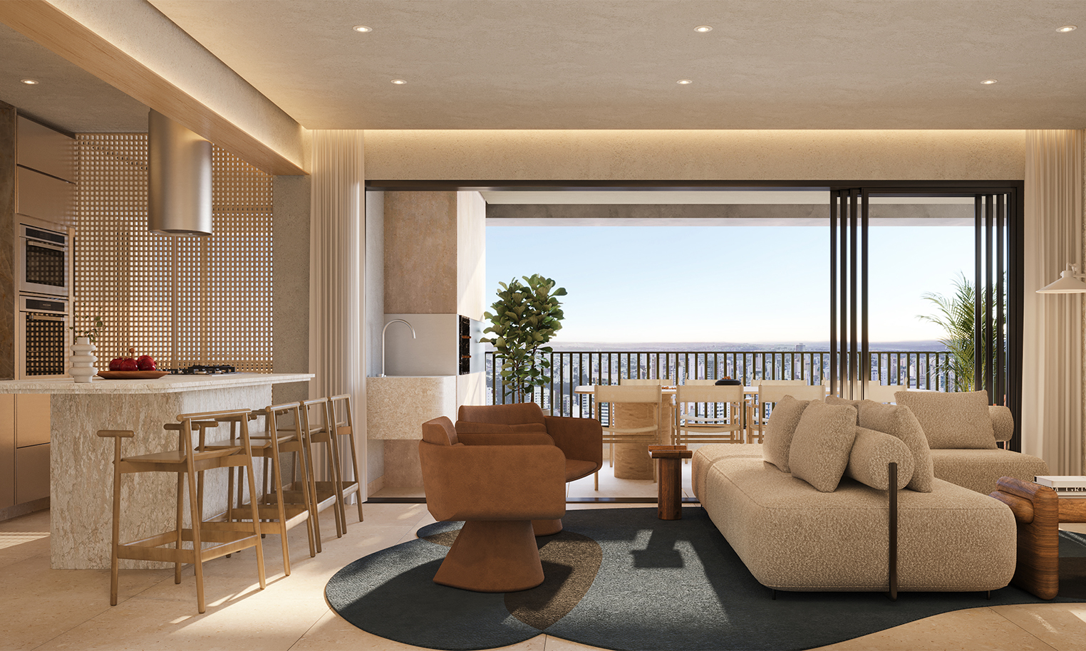 Claudia Albertini assina o decorado do Fascino Consciente com um olhar sofisticado e autoral. Seu trabalho traduz a essência do empreendimento por meio de composições equilibradas, escolhas precisas de mobiliário e uma paleta neutra e contemporânea que valoriza a luz e a arte. Cada ambiente foi pensado para transmitir aconchego, fluidez e elegância, criando uma atmosfera que reforça o caráter escultural e exclusivo do projeto.