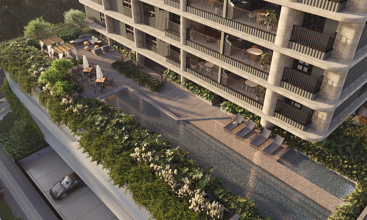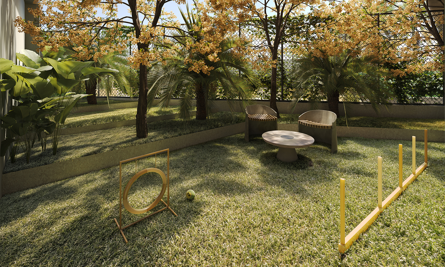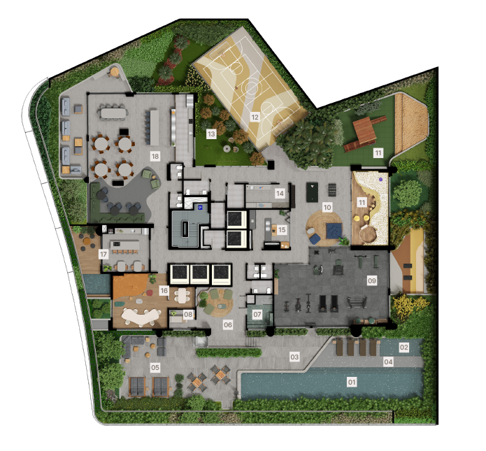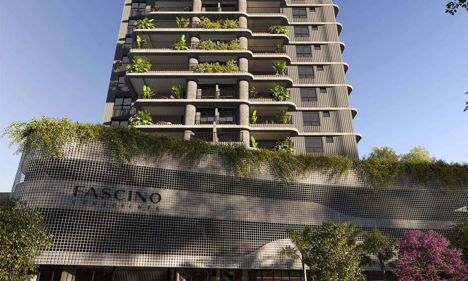 A Cardim Paisagismo assina o projeto, trazendo sua reconhecida expertise em botânica e design natural. Com vegetação 100% nativa, o paisagismo dialoga de forma orgânica com a arquitetura fluida do empreendimento, criando ambientes elegantes, acolhedores e profundamente conectados ao território. A seleção criteriosa de espécies e a composição equilibrada das áreas externas reforçam a sensação de bem-estar e elevam a experiência do morar no Fascino Consciente.